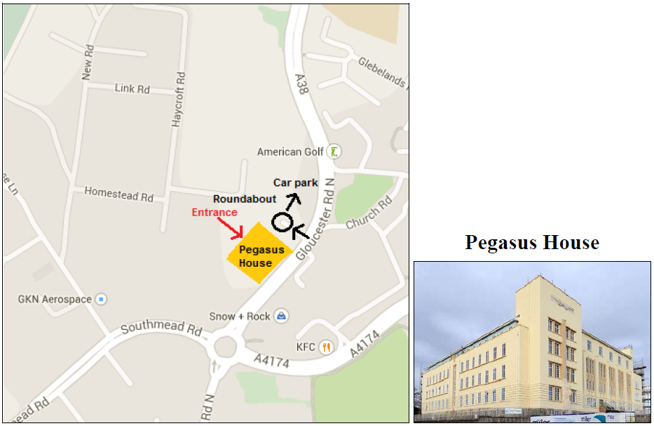 For visitors with no access to the Airbus site, please collect your visitor pass outside the entrance of the Pegasus House (see driving directions below).