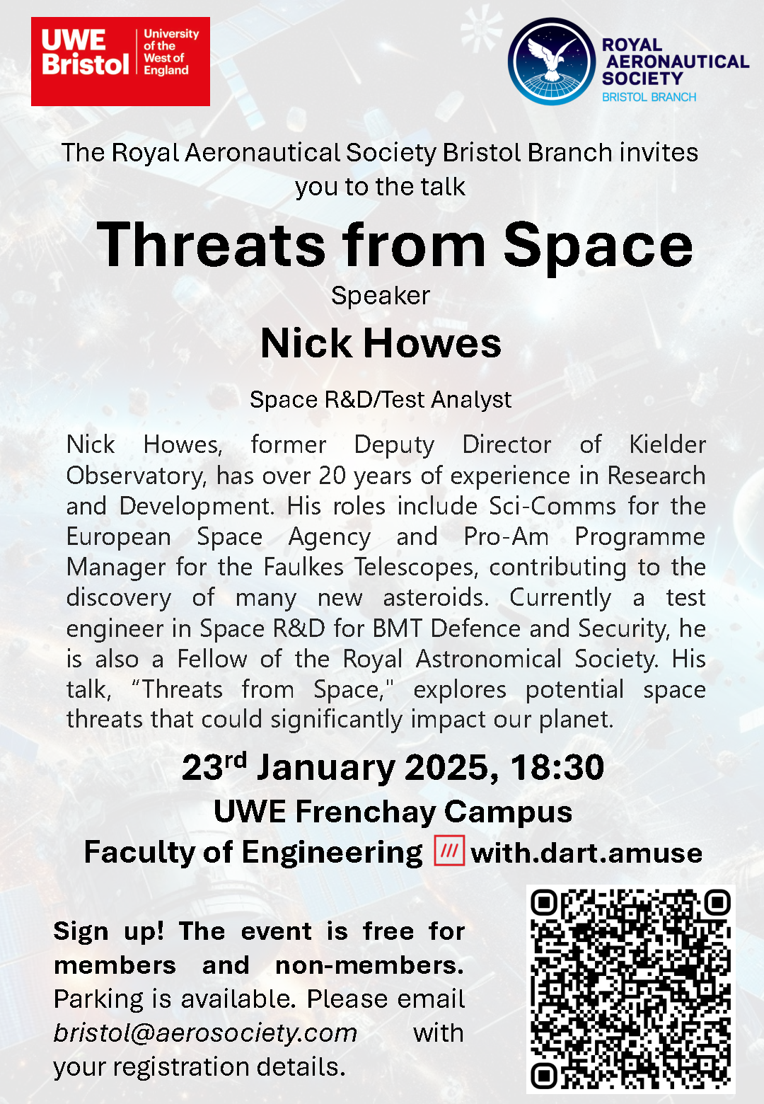 Please book a ticket here: RAeS Bristol Branch lecture: Threats from Space Tickets, Thu 23 Jan 2025 at 18:30 | Eventbrite